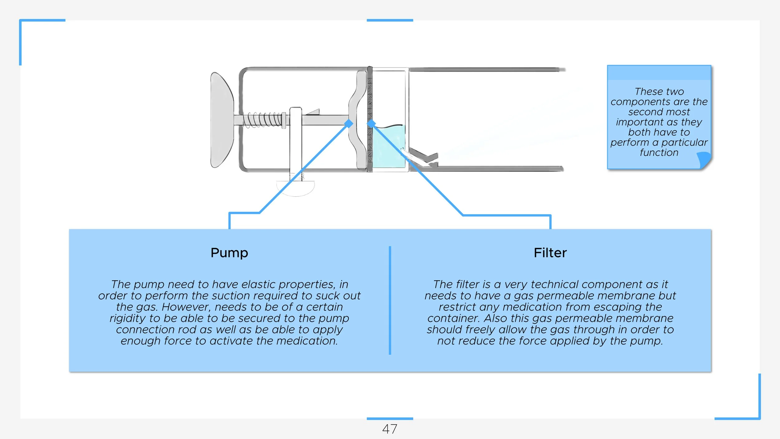 Firstly the handle is pulled back which in turn pumps out infused gas from the medication container through the filter and into the back casing.
