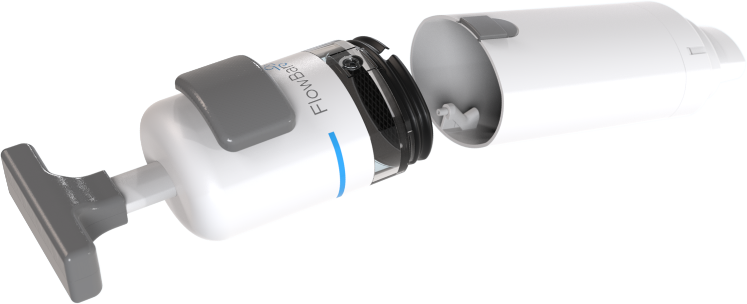 The two halves of the FlowBar detach from one another so the user is able to clean the chamber periodically to maintain an effective dose.